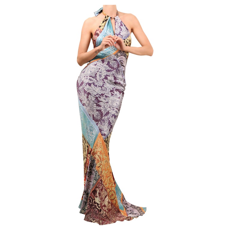 Roberto Cavalli Silk Floral Leopard Print Halter Neck Backless Maxi Dress Gown For Sale At 1stdibs